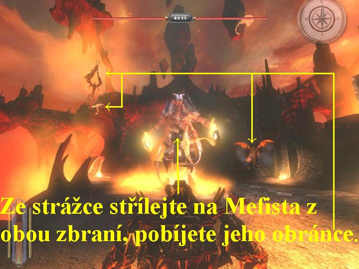 O tom, že jste již docela blízko k vámi hledanému vládci pekla, svědčí skutečnost, že stále přibývá jeho služebníků, kteří vám brání v cestě dál. Vydejte se tedy dopředu až na samý konec stezky, zde odbočte doleva a vydejte se dopředu k mechanickému ohnivému strážci, do kterého si nastupte. V něm potom pokračujte po stezce zpět, tak se dostanete až k Mefistovi, který je obklopen mnoha svými ochránci. Vᚠstrážce, ve kterém se nyní nalézáte, má sice poměrně tuhý život, ale na rozdíl od vás nedokáže své zdraví regenerovat, ani když se na chvíli ukryje před střelami nepřátel. Pobíjejte zněj z obou jeho zbraní tedy všechny Mefistovy ochránce (obr.4), poté co vám Mefisto a jeho přisluhovači vašeho strážce zničí, ocitnete se na vlastních nohou sami proti Mefistovi. Využívejte tedy všech možných úkrytů, abyste regenerovali vaše pošramocené zdraví a střílejte po Mefistovi a po jeho nohsledek z těch nejrazantnějších zbraní, které máte k dispozici, ukazatel jeho zdraví máte opět nahoře na hrací ploše, sám vládce pekel je ale velice odolný. Střílejte mu tedy na hlavu a na hruď, nejvíce zranitelný je ve chvílích, kdy roztáhne ruce. Poté, co se tohoto vládce pekel zbavíte, spustí se animace, v níž vás Mefisto, tato příčina všeho zla a lidského utrpení prokleje a definitivně se odporoučí. A to je tedy, vážení přátelé, vše, ještě si vyslechněte závěrečný komentář, v němž se dozvíte, že se lidstvo z válek stejně nepoučilo a i když jste vládce pekel zabili, žije tento dál v lidech, nebo zlo je naprosto nesmrtelné. A co tedy dál? Už skutečně nic, jen si můžete shlédnout závěrečné titulky.