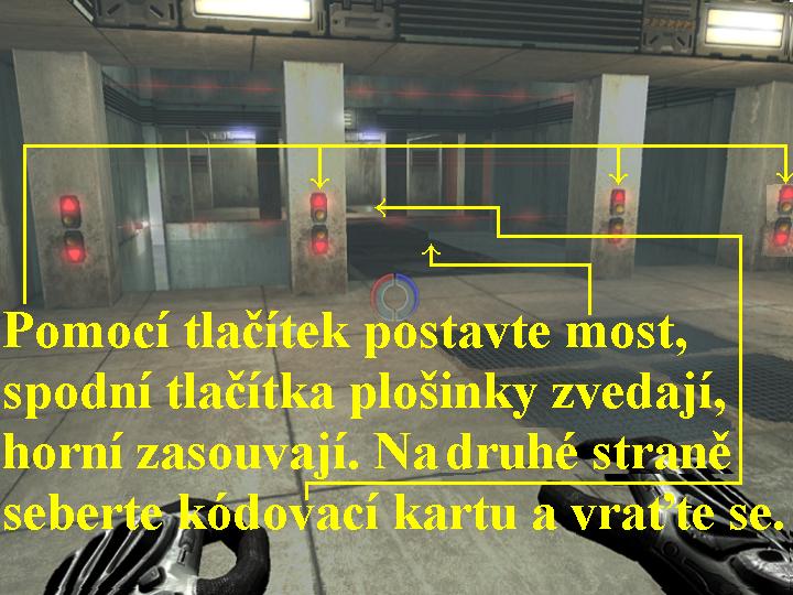 Vaším úkolem nyní je dostat se do spodního patra k čerpacím pumpám a zprovoznit je. Vejděte do druhé místnosti, uchopte bednu a hoďte ji na mříž v podlaze, tak ji odstraníte a vzniklým otvorem pak seskočte dolů. Aktivujte červené tlačítko, odsunete mříž, seskočte dolů, na druhé straně si vyskočte nahoru a naházejte do otvoru za vámi láhve s výbušným plynem. Poté vyskočte nahoru k mřížím, aktivujte červené tlačítko, mříž se na chvíli otevře, seskočte dolů vzniklým otvorem. Aktivujte červené tlačítko na podlaze, odsunete mříž, seskočte dolů a láhve s plynem naházejte nahoru. Nyní se vraťte zpět, seberte jednu z láhví a zapalte ji o oheň z poškozeného potrubí, láhev hoďte na dveře vpravo od jiskřícího spínače, tak láhev po chvíli vybuchne a rozrazí dveře. Seberte bednu, vstupte dovnitř, jděte doleva a bednu vhoďte na konci vpravo na mříž na stěně, tak mříž odstraníte, vskočte do vzniklého otvoru ve zdi. Přeskočte si na roury, seskočte na nižší, pokud se netrefíte a spadnete do vody, vylezte po lávkách na souš a vstupte do otevřených dveří. Před vámi jsou zatopené dveře, ty neotevřete, neboť vaše rukavice pod vodou nefungují. Aktivujte tedy spínač u protějších dveří a vejděte dovnitř, odbočte doleva a po můstku se přebroďte k protějším dveřím, aktivujte spínač a vstupte dovnitř. Zde se nalézají čtyři sloupy a na každém z nich jsou dvě tlačítka. Vaším úkolem nyní je postavit si z plošinek most pro přejití na druhou stranu. Ta spodní tlačítka vysouvají plošinky z vody nahoru, ta horní naopak tyto plošinky spouštějí dolů. Nastavte tedy pomocí všech tlačítek plošinky tak, aby vytvořily souvislý most, po kterém byste mohli přejít na druhou stranu, vyhýbejte se laserům, krčte se a přeskakujte je, kde ze země seberte kódovací kartu, poté se vraťte zpět (obr.1). Odbočte dvakrát doleva, přebroďte se na druhou stranu, na spínač protějších dveří použijte kartu a vstupte dovnitř. Po potrubích si vyskákejte nahoru až na to nejvyšší, po něm přejděte na druhou stranu, otočte se a přeskočte si na mřížovanou plošinku, aktivujte spínač a vstupte do dveří. Naproti na konci vidíte tři pojistkové skříňky, ale dozvíte se, že jsou nefunkční, budete tudíž muset sehnat nové pojistky. Seskočte tedy dolů do vody, pozor ať se neutopíte, sledujte ukazatel vzduchu ve vašich plících, plavte pod vodou kolem mříží a lávek stále vpřed, pokud vám dochází v plících vzduch, můžete při plavbě vylézt na některou z lávek a nadechnout se. Tak doplavete pod vodou až k poslední lávce, po které vylezte nahoru, jděte k rouře, proskočte do otvoru nad ní, poté druhým otvorem výš, ocitli jste se tak u veliké odpadové roury. Seskočte do ní, hned na samém kraji seberte baterii, prolezte rourou na druhý konec, zde vyskočte na zídku k výše položené rouře, prolezte jí opět až na konec, seberte druhou baterii. Vlezte do sousední routy, i jí prolezte až na konec, seskočte dolů, vstupte do další roury, na konci seberte třetí baterii. Vskočte do otvoru nad vámi, skrčte se a popojděte vpřed, opět vás počne napadat vám již známá, velice nepříjemná detekční koule. Odmrštěte ji do některé z rour a rychle si vyskočte do otvoru ve zdi nad vámi, skrčte se, vstupte dovnitř, na druhé straně seskočte do vody, pokud vás koule bude i nadále pronásledovat, zavřete ji za dveře. Z vody vylezte na plošinky, z nich na plošinku vpravo nad vámi, přeskočte si na roury, poté si postupně přeskákejte ke třem pojistkovým skříňkám a pojistky v nich vyměňte za funkční. Vraťte se na první routu, z ní seskočte dolů doprava k otevřenému vchodu, vylezte do něj a plavte pod vodou zpět, na konci vlevo vylezte doprava na můstek a projděte dveřmi. Jděte k panelu a aktivujte jej, odsouhlasíte Oskarovi, aby začal budit osádku, vypustili jste tak vodu u dveří od panelu dole vpravo. Seběhněte tedy k těmto dveřím po schodišti, aktivujte spínač, poté dveřmi projděte, pokračujte lomenou chodbou vpřed a dojděte až k vratům, tím tato část končí.