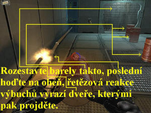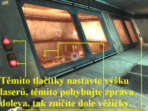Vydejte se chodbou dopředu, odbočte doleva, na konci doprava, pak znovu doleva a rychle se před střeleckou věžičkou ukryjte za sloupem. Věžička po vás bude pálit, takže se vyhýbejte jejím střelám a procházejte se tam a zpět kolem skleněných výplní, její střely, které nesmějí zasáhnout vás, ale rozbijí skleněné výplně a vy tak můžete vstoupit do chodby, kde z podlahy seberte přístupovou kartu. Vraťte se zpět a aktivujte spínač u dveří, projděte do chodby a dveře za sebou ihned zavřete. Jděte doleva, odbočte vpravo, přeskočte lasery, vpravo na konci seberte bednu, vraťte se a vlevo bednou rozbijte mříž v podlaze. Seskočte dolů, před tím ještě hoďte bednu dolů do otvoru, dole si přisuňte bednu pod lasery tak, abyste měli přístup k barelům dole v otvoru v podlaze. Seberte barel, otvorem povyhoďte výš, vyskočte si za ním a vhoďte ho za pohyblivé lasery na zeď za nimi, tak zeď prorazíte. Otočte se, seskočte dolů, vytupte do chodby vlevo, otvorem ve stropě, jakmile přejedou lasery, si vyskočte nahoru, otočte se a a jděte k otvoru ke zdi, který jste si před chvílí vybourali. Projděte jím, poté aktivujte vpravo dveřní spínač a projděte dveřmi, ocitli jste se v malé prosklené hale. Vlevo na začátku a vlevo na konci jsou na sloupech tlačítka, která posunují vlevo dole za sklem lasery, tam se nacházejí i dvě strážní věžičky, které nyní musíte nejdříve zlikvidovat. Ta první tlačítka vlevo, zvedají, či snižují výšku laserů, ta vlevo vzadu posunují lasery zprava doleva a naopak. Nejdříve si tedy nastavte výšku laserů tak, aby byly na úrovni střeleckých věžiček, poté zadními tlačítky posunujte lasery do stran, tak tyto narazí do věžiček a obě výbuchem zlikvidují (obr.2). Poté na konci vpravo seskočte dolů a vydejte se doleva, poté znovu doleva, před vámi je další střelecká věžička. Schovejte se doprava za zeď, jakmile věžička přestane střílet a doběhněte si doprava pro láhev s plynem. V pravý čas ji hoďte na věžičku, ta láhev rozstřelí a tak se sama zničí. Seberte další láhev a přes lasery ji hoďte na narušenou zeď, tak vybuchne a vy projděte dál vzniklým otvorem. Seberte barel, jděte doprava, objevivší se dotekovou kouli barelem na chvíli paralyzujte, seberte ji a hoďte ji na pancéřové dveře, tak vybuchne a dveře rozrazí. Seberte další barel, znovu jím detekční kouli paralyzujte, seberte je a hoďte ji na druhé pancéřové dveře, tak vybuchne a rozrazí i druhé dveře. Vše si zopakujte a tentokráte hoďte kouli do hlubiny mezi oběma pancéřovými dveřmi, potom těmito dveřmi proskočte. Jděte doleva a projděte dveřmi, hned za nimi vlevo jsou spínače, kterými lze posunovat lasery. Posuňte je tedy dopředu tak, vybyl jejich tok přerušen sloupem, potom se pravou stranou vydejte na konec, kde seberte barel. Vraťte se, barel položte ke spínačům, nyní lasery nastavte tak, aby směřovaly na narušenou zeď vpravo. Seberte barel a hoďte je přes lasery na narušenou zeď, tak vybuchne a způsobí otvor ve zdi. Vraťte barely tak, abyste tímto otvorem mohli projít, vstupte do chodby a na jejím konci do místnosti. Ozve se vám Oscar a oznámí vám, že pracuje na otevření dveří. Nyní tedy musíte s barelem a koulí laborovat tak dlouho, dokud se mu dveře otevřít nepodaří, tedy známým způsobem odrážet její útoky. Jakmile se Oscarovi dveře podaří otevřít, rychle jimi projděte, v chodbě odbočte doleva, opět paralyzujte barelem koulí a hoďte ji na narušenou zeď na konci chodby vpravo, projděte dál vyraženým otvorem. Naskočte nahoru na potrubí, přejděte na další, pokračujte doprava, seskočte níž mezi lištami ventilátoru, druhý ventilátor vypněte tlačítkem. Vejděte do chodby, na konci chodby je další automatická střelecká věžička, kryjte se a seberte barel, vraťte se do uličky a barel na ni hoďte, tak tato vystřelí a udělá vám díru v podlaze. Rychle do díry seskočte, jděte vpřed, obdržíte další instrukce od Oscara, pokračujte lomenou chodbou vpřed, poté co dojdete až k vratům, tuto část zakončíte.