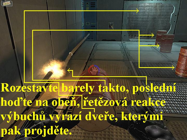 Projděte vraty, jděte vpřed, Kelvin vás upozorní na hrozící nebezpečí ze strany strojníka Norwooda, který vás chce předběhnout. Na křižovatce odbočte doleva, ale vyčkejte, až lasery dojedou úplně až doprava, poté rychle utíkejte doleva, zabočte doprava a vyskočte si nahoru do chodby. Jděte vpřed, ignorujte všechny spínače, mezerou ve skleněných výplních si přeskočte na plošinku, ve správnou chvíli si mezi lasery seskočte dolů, jděte až na druhou stranu, kde si opět mezi lasery vyskočte nahoru na plošinku. Vydejte se doleva, pokračujte vpřed lomenou chodbou, ozve se vám Kelvin, vlevo je transportní plošina, která je však zatím nefunkční. Na konci chodby tedy projděte dveřmi doprava, Na konci chodby si vyskákejte až nahoru a přeskočte si ke dveřím, kterými projděte. Vlevo aktivujte plošinku, a jak tato začne pomalu stoupat nahoru, seskočte do otvoru v podlaze, vlevo si vyskočte výš a odtud rychle na stoupající plošinku, tak vás tato vyveze až nahoru. Sestupte na rampu, na jejím konci seberte přístupovou kartu, vraťte se na plošinu, aktivujte spínač, tak počnete klesat dolů. Z plošiny si zavčas seskákejte až dolů do šachty a vyskočte si nahoru ke spínačům, kde jste před chvílí aktivovali spínače pro pohyb nahoru. Vraťte se zpět až k transportní plošině, aktivujte spínač, tak se plošina rozjede a vy si na ni rychle přeskočte. Za rameny jedoucí plošinky se kryjte před palbou střeleckých věžiček, jakmile plošina zastaví, přeskočte si doleva a utíkejte vpřed, opět se kryjte a uhýbejte před palbou střeleckých věžiček, přeskočte si do vstupní místnosti před vámi. Jděte vpřed, opatrně seskakujte do otvoru vlevo pod vámi až dolů, nyní rozestavte barely tak, aby až vybuchnou, exploze vyrazila dveře (obr.3). Znamená to, že první barel si přineste ke dveřím a postavte ho na zem asi metr od dveří, druhý barel postavte asi dva metry za první, třetí rovněž postavte asi dva metry za druhý. Doneste si čtvrtý barel, stoupněte si do bezpečné vzdálenosti od hořícího unikajícího plynu z potrubí a barel na oheň hoďte. Tak dojde k hromadnému řetězovému výbuchu, který vyrazí dveře, kterými poté bezpečně projděte dál. Tlačítko na podlaze je nefunkční, takže nyní přestavte bedny na pravou stranu tak, aby přerušily tok laserových paprsků, jeden paprsek si však ponechejte aktivní. Vraťte se zpět pro další barel a vhoďte jej na poslední aktivní laserový paprsek, tak dojde k výbuchu, který vyrazí mříže v podlaze. Seskočte tedy do vzniklého otvoru, vydejte se vpřed ke známým vratům, která vedou do místnosti s hlavním počítačem, je tedy zřejmé, že jste předběhli strojníka Norwooda a od Kelvina se dozvíte, že stojíte už téměř u cíle vaší dlouhé pouti.