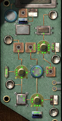 fialového skla. Do pěti zásuvek vpravo umístěte pět kulových kondensátorů.