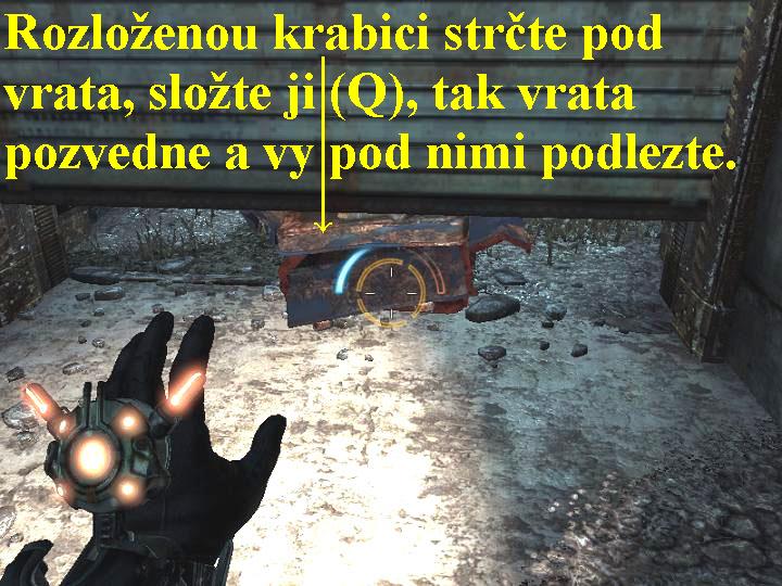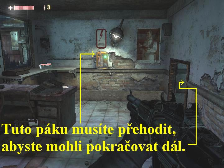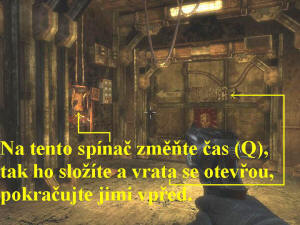 Poté, co Kathryn opustí místnost, projděte do vedlejší místnosti a prohledejte popelnici, skočte do vody a vpravo seběhněte dolů po schůdcích do vody, plavte rychle pod vodou vpřed lomenou chodbou (přidržujte levý Shift), sledujte ukazatel množství kyslíku ve vašich plicích, proplavte až na druhý konec, kde z vody vylezte na souš. Prohledejte místnost, posbírejte vše užitečné, po schodišti vyběhněte nahoru a po lávce pokračujte vpřed. Na konci si u automatu vylepšete zbraň, když ještě před tím otevřete a aktivujte modrou bedýnku, poté projděte dál modrými dveřmi. Pokračujte doprava, seběhněte dolů, popojděte vpřed a projděte dál vraty vpravo. Vyběhněte po schodech nahoru, skolte mutanta, vydejte se doleva, ve výklenku vlevo si vylepšete zbraň, jděte dál vpřed a na konci vyberte popelnici, pokračujte doprava. Vpravo seberte munici, seběhněte dolů, skolte dalšího mutanta, odbočte doprava, v místnosti vpravo si přečtěte dopis, posbírejte vše užitečné, přejděte do vedlejší místnosti. I zde nejdříve posbírejte všechny užitečnosti, otevřete si červenou skříňku, poté ustřelte zámek u dveří a dveřmi projděte. Skolte mutanta, jděte k soše Lenina a prohledejte okolí, posbírejte všechny užitečné předměty, mrtvole seberte samopal. Zkuste projít dveřmi, ale nepůjde to, napadne vás však houfec mutantů, který musíte do jednoho zlikvidovat. Tak se vám otevře cesta dál, vystoupejte po schodišti, přejděte lávku, ozve se vám Kathryn, po dalších schodech slezte dolů, vstupte do vchodu vpravo. Vylepšete si zbraň, skrčte se a podlezte do vedlejší místnosti, zbavte se mutantů, v další místnosti si přečtěte dopis, vylepšete si zbraň a na zdi pak přehoďte páku (obr.1), pokračujte dál zpřístupněnou cestou otvorem vpravo. Vraťte se a pokračujte dál pootevřenými dveřmi, v chodbě vpravo si vylepšete zbraň, vraťte se a pokračujte stejnou chodbou vpřed. Zabočte doprava, na konci vpravo se zbavte mutantů pomocí hydroxidových náloží, vylepšete si zbraň a přehrajte si zvukový záznam, poté vstupte do prázdného tubusu, je to výtah. Vyjedete tak automaticky nahoru, kde si vystupte, seběhněte dolů po schodišti, vstupte do podzemní štoly, pokračujte vpřed. Na konci odbočte doleva a seběhněte dolů, prohlédněte si filmový archív, poté projděte kulatými pancéřovými dveřmi, pokračujte vpřed a na konci aktivuje Časové manipulační zařízení (TMD), které umožňuje hýbat předměty skrze čas a měnit jejich stav mezi starým a novým pohledem (Q). Získali jste tedy novou dovednost, ale chodba zpět je nyní zavalená. Vracejte se jí ale přesto zpět, měňte pohled na starý (Q), tak budete zával postupně odstraňovat, před kulatými dveřmi použijte změnu času i na časovou trhlinu vpravo na zdi (Q), tak si otevřete kulaté pancéřované dveře a projděte jimi do laboratoře. Nyní si můžete spustit i obnovování energie (kolečko myši), zaměřte s tedy na torzo schodů a obnovte je, poté po nich vystoupejte nahoru, vstupte do štoly a jděte vpřed, na konci si obnovte schodiště (Q), vyběhněte po něm nahoru, otevřete si tubus (výtah) a nastupte si do něj. Spojí se s vámi Kathryn, dole si vystupte, musíte si pomoci dál časovou trhlinou. Vstupte tedy do ohnivého kruhu, změňte čas (Q), pomocí nápovědy (F) si vyvolejte modré fosforující šlápoty, které sledujte a pokračujte vpřed, likvidujte nepřátele. Na konci lávky projděte modrými dveřmi doprava, zlikvidujte Rusáky, v místnostech vpravo přehoďte po sobě obě páky, tak si otevřete cestu dál, ale zároveň uvolníte cestu k vám i ruským vojákům, takže buďte ve střehu a včas je zlikvidujte. Nezapomínejte stále vyvolávat fosforující modré šlápoty (F), dovedou vás až k doktorovi Barisovi. Prohledávejte všechny přilehlé místnosti, na konci chodby projděte modrými dveřmi a rychle skolte Rusáka, než se mu podaří zastřelit doktora Barisova. Po chvíli se však objeví další Rusáci, skolte je a následujte doktora Barisova, u dveří získáte nový druh energie, poté dveřmi projděte a zbavte se dalších nepřátel. Doktor však nebude moci otevřít trezor, zaměřte se tedy na trezor vy, vraťte čas (Q), tak Barisov trezor otevře a získá velice razantní zbraň. Přistupte k doktorovi a zbraň mu seberte (R), poté z nich zlikvidujte několik Rusáků. Vstupte dveřmi do chodby a jděte vpřed, včas likvidujte ruské vojáky, na konci vyběhněte po schodech nahoru, vstupte do chodby, doktor vám otevře dveře. Skolte další Rusáky, pokračujte chodbou vpřed, vstupte do místnosti, likvidujte další Rusáky, pomáhat si můžete rozstřelováním láhví s plynem, prostřílejte se dopředu, seberte sniperku, prohledejte přilehlé místnosti, seberte vše užitečné a popřehazujte páky. Tak za vámi Barisov doběhne, vstupte do místnosti a časovou trhlinou, což je známý ohnivý kruh, do kterého vstupte a změňte čas (Q), se přenesete do roku 2010. Nejdříve si tedy prohlédněte filmový archív, poté aktivujte AUGMENTOR, vylepšete si, co uznáte za vhodné a na co máte finance, ještě si vylepšete zbraně, poté otevřenými dveřmi vstupte do podzemí, aktivujte si zborcené lékárničky (Q), na konci projděte dveřmi. Prohledejte místnosti, na přístroji si vylepšete dovednosti, přečtěte si dopis, aktivujte i Zbrojírnu, popadněte gravitační předmět a hoďte ho před sebe. Pokračujte vpřed, obnovte si bedýnku s municí a pak munici seberte, o kousek dál seberte energii a jděte k trezorovým dveřím. Na panel vlevo od nich použijte vrácení času (Q), tak dveře otevřete, projděte jimi, seberte předmět (E) a vhoďte ho do otvoru ve zdi, skrčte se a prolezte za ním. Vylepšete si zbraň, předmět přeneste pod rampu, nask