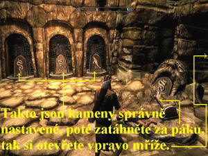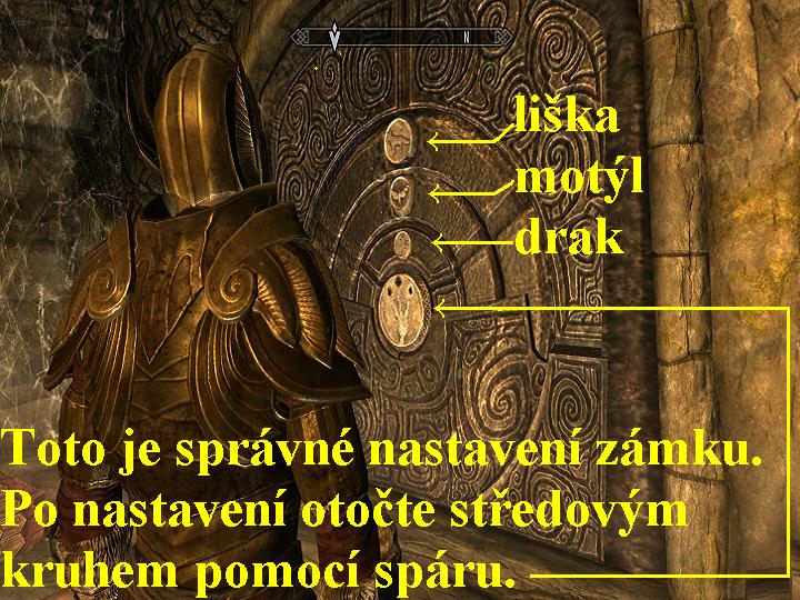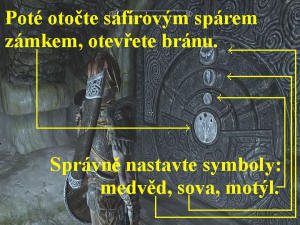 Zadejte si tedy novou značku na mapě. Přes mapu se tam nedostanete, jedete totiž do oblasti, kterou ještě nemáte prozkoumanou. Nasedněte tedy na koně, není to sice vámi zakoupený kůň, ale bez skrupulí ho ukradněte a vydejte se na jihovýchod k Ivarovu Dvoru, směrem Vyšnému Hrothgaru na Úbočí Jícnu Světa. Přejděte přes Zlatopalcův Medodar, pokračujte dál a přejděte přes Hlásku u Bílé Řeky, poté přes Ležení Bouřných Hávů u Bílého Průsmyku. Obejděte zleva vysoké zasněžené hory, pokračujte po cestě na východ, vyběhněte na Šedou Skálu, kde pobijte Obry. Můžete prohledat i Jeskyni, kde naleznete spousty užitečných předmětů, poté vyjděte ven a vydejte se na jih. Seběhněte schodiště a vydejte se doprava po kamenné cestě. U Věže Valtheimu se raději vyplaťte banditům, poté je můžete zezadu opatrně okrást, nebo je pobít, po kamenné cestě pokračujte na jih. Narazíte na vojáky Bouřných Hávů, dejte jim souhlas k připojení se k jejich sdružení, jděte dál, zabijte Sprigana a Šavlozubou kočku, skolte i Lovce a Lišku. Přejděte přes Úkryt ztraceného nože, úkryt prohledejte, i zde najdete mnoho užitečností, pobijte další bestie. Po klikaté horské kamenné stezce stoupejte stále výš, kouzlem Plamen se zbavte Přízraku, stejným kouzlem zlikvidujte i Matku Bludiček, vstupte do řeky a plavte vpřed. O kousek dál vylezte vlevo na skály, zlikvidujte Trolla, vydejte se vpřed, odbočte doprava za kamzíkem, pokračujte stále výš, tak dorazíte na Ivarův Dvůr. Vstupte do Vilemyrovy Krčmy, promluvte si s hostinským, proberte s ním všechny nabídky dialogů, přespěte u něj, poté mu předejte deník, dostanete od něj za to Safírový Spár, ten budete za chvíli nutně potřebovat. Pokud chcete přijmout některé vedlejší úkoly a nakoupit potřebné, i podat nepotřebné, pak si pohovořte i s ostatními přítomnými. Poté vyjděte ven, vstupte do Klimmekova domku, dveře však musíte vyháčkovat, zabijte Strážce a vše důkladně prohledejte, je na vás, co uznáte za potřebné, ať se nepřetížíte, nemohli byste pak běhat. Vyjděte ven a prohledejte i ostatní domky, poté vstupte do Mohyly Zakrytého Krbu, projděte pozlacenými dveřmi, sestupujte dolů. Používejte všechny páky a držadla řetězů, abyste si zpřístupnili cestu vpřed otevíráním dveří, i ke skrýším, které důkladně pohledávejte a likvidujte přízraky, střežící poklady, v jedné z místností si můžete namíchat i lektvary, pokud máte u sebe potřebné ingredience (například pavoučí vajíčko, slepičí vejce a zářivou houbu). Poté se vydejte chodbami na jihozápad, dojdete k bráně, kde opět musíte nastavit zámek. Nastavte tedy na vnitřním okruhu medvěda, na prostředním sovu a na vnějším motýla, poté safírovým spárem otečte uprostřed zámkem, tak bránu otevřete, pojděte jí (obr.2). Pokračujte vpřed, pobijte Draugiry, vlevo ve výklenku pak přehoďte páku, za výklenkem vlevo projděte bránou, vyběhněte točité schodiště a projděte dvěma železnými branami. Seskočte dolů, pobijte další Draugiry a Kostlivce, vyběhněte výš po dřevěných schodech. Probíjejte se stále chodbami vpřed, pozor na smrtící kyvadla a vražednou bránu, vyháčkujte další bránu před vámi, projděte přes ni výš, stoupněte si na kruh v podlaze, tak si otevřete dveře. Za nimi skolte dalšího Draugira, v síňce před vámi se otáčejí čtyři stěny, na nichž se po chvílích objevují symboly. Podle nich nastavte kameny před vstupem do síňky, tak jste si za zády vytvořili most, po kterém přeběhněte, jděte vpřed a na konci projděte dveřmi do Mohyly Zakrytého krbu. Jděte vpřed, vlevo zatáhněte za držadlo řetězu, odvalíte tak balvan, pokračujte chodbou vpřed. Na konci chodby zatáhněte za druhé držadlo řetězu, po odvalení balvanu vstupte do malé místnosti. Vpravo si můžete namíchat lektvary, pokud máte potřebné ingredience, poté pokračujte vpřed, pak prohledejte i přilehlé místnosti, na konci vyběhněte po schodišti nahoru a dveřmi projděte do Skyrimu. Projděte chodbou ven na volné prostranství, přes mapu se vydejte k Šedé Skále, poté opět přes mapu k Věži Valtheimu, zde odbočte na jih a pokračujte přes Úkryt Ztraceného nože dále na jih až do Ivarova Dvorce.