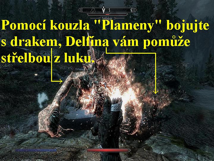 Vydejte se dopředu, přímo proti vám na konci po pravé straně se nachází vchod do Hostince u Spícího Obra, vstupte tedy dovnitř. Prohledejte všechny místnosti, poté vyhledejte Delfínu, proberte s ní všechny nabídky dialogů, pronajměte si pokoj a vyspěte se do rána, znovu si s Delfínou promluvte. Dozvíte se, že to byla ona, kdo sebral v Ustengravu Jurgenův Roh, navíc vám Jurgenův Roh předá. Poté si pohovořte i s Organem, i s ním proberte všechny nabídky dialogů, s jeho svolením můžete použít i malou alchymistickou laboratoř k vyrobení kouzelných lektvarů, samozřejmě, pokud máte v inventáři potřebné ingredience. I jeho požádejte za úplatu o vyspání se až do rána, po vyspání vyjděte ven a přes mapu se vydejte znovu do Vyšného Hrothgaru, kde si znovu promluvte s Angeirem, naleznete ho pravděpodobně spícího v posteli ve vyšším poschodí. Vzbuďte ho, promluvte si s ním, předejte mu Jurgenův Roh, následujte ho do Obřadní Síně, kde projděte nápisem na podlaze, tak se zúčastníte podivného obřadu. Přistupte k Wullfangovi, naučí vás nový trik, Kouzlo Moci, sklidíte uznání Šedovousých. Vyjděte ven a znovu se vydejte zpět do Vorařova, vstupte do Hostince u Spícího Obra, vyhledejte Delfínu. Nalézá se nyní v malé komůrce před skříní, od které však nemáte klíč. Klíč nehledejte, stačí za sebou zavřít venkovní vstupní dveře od komůrky, tak Delfína sama skříň otevře, je to tajný vchod, následujte ji po schodišti dolů, zde si již s vámi pohovoří. Proberte s ní všechny dialogy, zeptejte se jí, kam se nyní vydat, tak vyjde ven, vy jí následujte. Držte se jí jako klíště, o ni se bát nemusíte, dokáže se všem bestiím a banditům ubránit sama, samozřejmě že vaše aktivní pomoc je vítána, jen se připravte na dlouho trvající putování. Nyní tedy musíte následovat pěšky Delfínu, po dlouhé době dojdete až k Dračímu pohřebišti do Kynina Hájku. Jak se tam dostanete, uvidíte Alduina, jak se vznáší nad hrobem mrtvých draků a provádí rituál k oživení draka Sahloknira. Až Alduin draka oživí a druhý drak odletí, musíte raka Sahloknira zabít. Jakmile ho oslabíte, nejlépe to jde kouzlem Plameny, nebude moci vzlétnout, Delfína vám bude vydatně pomáhat střelbou z luku, zůstane dřepět na zemi a můžete ho upálit už velice lehce (obr.3). Poté, co do vás přejde duše Sahloknira, promluvte si zase s Delfínou, proberte s ní všechny nabídky dialogů, obdržíte nový úkol setkat se s ní znovu ve Vorařově. Situace je totiž velice vážná, mnohem horší, než se Delfína doposud domnívala. Nejenže se draci vracejí k životu sami, ale jejich druhové je navíc sami znovu vyvolávají. Thalmor by tyto přerostlé a krvelačné, velice nebezpečné bestie na svět nepřivolával jen tak pro nic za nic, rozhodně je za tím nějaký nekalný a zlý účel. Delfína si tudíž chce promluvit se svými společníky o tom, jak bychom se mohli co nejlépe dostat na Thalmorské velvyslanectví. Jděte tudíž za Delfínou zpátky do Vorařova, nikoliv přes velkou mapu, ale pěšky, opět se držte Delfíny a nespouštějte ji z očí. Pokud jste se nakazili Vampirismem, úkol nedokončíte, neboť na denním světle se vás všichni bojí a zaútočí na vás, taktéž i Delfína učiní totéž a dál vás nepovede. Buďto se tedy musíte posunovat v čase tak, abyste se neocitli na denním světle (měnit čas kdekoliv po použití klávesy „T“), nebo se musíte po nakažení, nejlépe co nejrychleji, vyléčit obyčejným lektvarem pro léčbu nemocí, popřípadě návštěvou svatyně Talose. Být Vampírem ostatně sebou nese více nevýhod, než kladů, takže to raději učiňte co nejdříve.