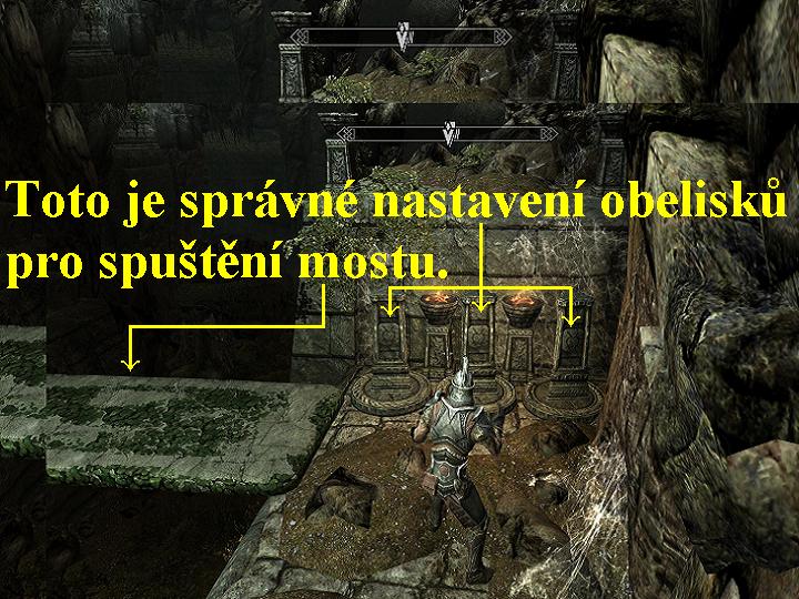 Pokud jste se tam tedy s vašimi přáteli ocitli, zabijte nejdříve Ledového Draka, sejděte po schodišti dolů a na protější straně zlikvidujte i ostatní nepřátele. Poté se vraťte po schodišti zpět, vpravo ve skalách je vstup do Chrámu Nebeského Útočiště, vstupte tedy do této jeskyně. Jděte vpřed, jakmile přátelé vyběhnou schodiště a zastaví se, budete jim muset připravit cestu dál. Před vámi se nachází tři kamenné obelisky, kterými lze otáčet, dobře si je prohlédněte, jsou na nich symboly. Promluvte si s Esbernem a proberte s ním všechny nabídky dialogů, poté totéž udělejte s Delfínou, pokud vám neporadí, což se může stát, potom je další postup jen na vás. Natočte tedy obelisky tak, aby se na všech nacházel symbol připomínající jakýsi jablka se dvěma stopkami, tak vlevo od obelisků spustíte můstek (obr.4), po kterém postupujte dál. Následujte oba přátele, vyběhněte schodiště, na konci místnosti zatáhněte na stěně za držadlo řetězu, poté vstupte vpravo do otvoru, který jste si takto otevřeli a spustili tam dolů další můstek, pokračujte po něm vpřed chodbou. Vyberte truhlici, jděte doprostřed místnosti, stoupněte si na kruh v podlaze, skrčte se a aktivujte ho, tak prolijete kapku krve a tím si otevřete vchod před vámi. Vyběhněte schodiště a projděte dveřmi, po dalším dlouhém schodišti vyběhněte až nahoru. Tak se ocitnete před Alduinovou zdí, nejdříve pohledejte přilehlé místnosti, mimo jiné tak naleznete i těžkou zbroj a knihu, poté si pomluvte s oběma přáteli, zeď prozkoumejte. Poté vyběhněte další schody, nato druhé a dveřmi projděte do Skyrimu, přes velkou mapu se vydejte do Vyšného Hrothgaru.