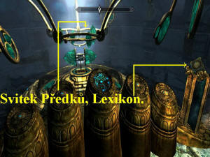 Probíjejte se vpřed, projděte dveřmi, prohledejte okolí a zatáhněte za páku, pokračujte dál po schodišti, které jste si takto zpřístupnili, dveřmi projděte do Černoty. Vpravo na konci přeskočte zídku, seběhněte dolů po schodišti, zbavte se po okolí všech nepřátel a podle malé mapky se vydejte ke zlaté bráně, kde zatáhněte za páku. Oživíte tak robotického Trpasličího Setníka, kterého zlikvidujte. Doběhněte ke vchodu do Katakomb Tichého Města, projděte jim do Čerpací Stanice, odtud dveřmi ven do Černoty a dalšími dveřmi do Debatní síně. Ihned za dveřmi se zbavte Falmerských Sluhů a jejich poskoků, po točitém kamenném schodišti se probijte dolů, vstupte do Katakomb Tichého Města. Proběhněte až na druhou stranu, dveřmi projděte zpět do Černoty, utíkejte až k bráně, vstupte do dveří, přehoďte páku, tak si otevřete vstup do Mzarkovy Věže. Projděte dveřmi, odbočte doleva, po spirálové plošině vyběhněte nahoru, kde posbírejte ze stojanů Potrhané Knihy, poté vyběhněte ještě výš, jděte k podivnému přístroji (obr.5). Do něj úplně vpravo vložte prázdný Lexikon z vašeho Inventáře, stiskněte druhé tlačítko zprava, poté první tlačítko zprava, Všimněte si, že po těchto úkonem se oblouky přístroje před vámi přetáčejí. Vaším úkolem tedy je pokračovat paprsků tak, aby tyto směřovaly na lupy. Pokud tedy vše nastavíte správně, každé správně nastavené tlačítko se automaticky uzamkne a rozsvítí se vám další, které použijte. Jakmile se vám to vše podaří, otevře se vám na přístroji tuba se Svitkem Předků, jděte si tedy pro ni, seberte ji, vraťte se k ovládacímu panelu přístroje a nezapomeňte si sebrat zpět váš Lexikon, budete jej totiž ještě potřebovat při plnění následujících úkolů. Poté seběhněte dolů, kde zabočte doprava k páce, kterou přehoďte. Tak se ocitnete nazpět v Černotě, jděte vpřed, zlikvidujte Obra, prohledejte Mlčenlivé Rozvaliny, poté se vraťte do Černoty a utíkejte k bráně. Před ní stiskněte tlačítko, tak odstraníte mříže, vejděte dovnitř, kde zatáhněte za páku, poté za druhou vpravo, tak se ocitnete nazpět ve Skyrimu, kde se ihned zbavte Ledního Medvěda, poté se přes velkou mapu přeneste do Jícnu Světa.